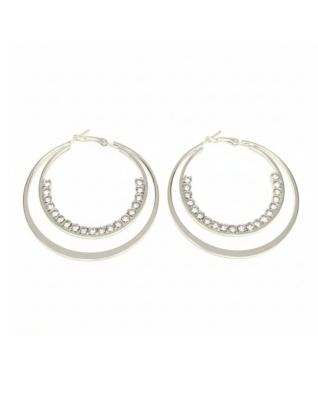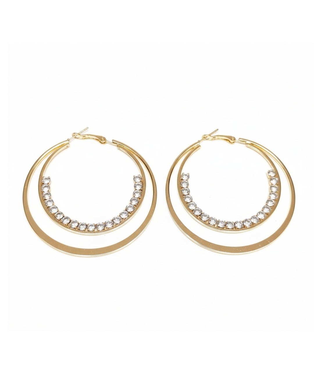 Double Circle Stones Embedded Hoops feature interlocking hoop design studded with shining stones. Perfect for adding glam to party wear or for elevating casual outfits, they deliver sparkle and structure in one stylish pair.