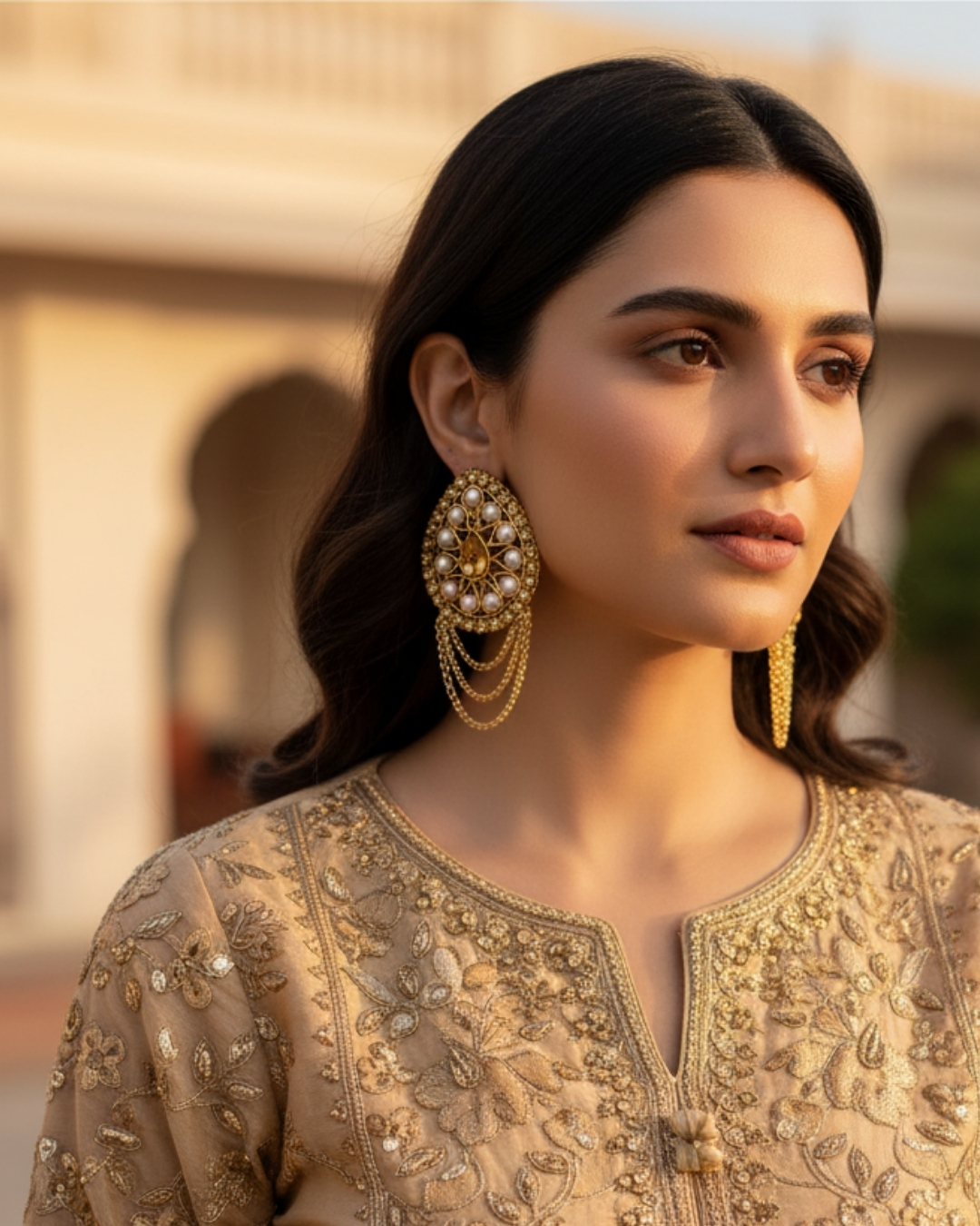 Embrace tradition with elegance in our Ethnic Gold Style Earrings. Featuring intricate detailing and a classic golden finish, these earrings radiate cultural charm and timeless beauty. Perfect for weddings, festive occasions, or pairing with ethnic outfits for a regal touch.
