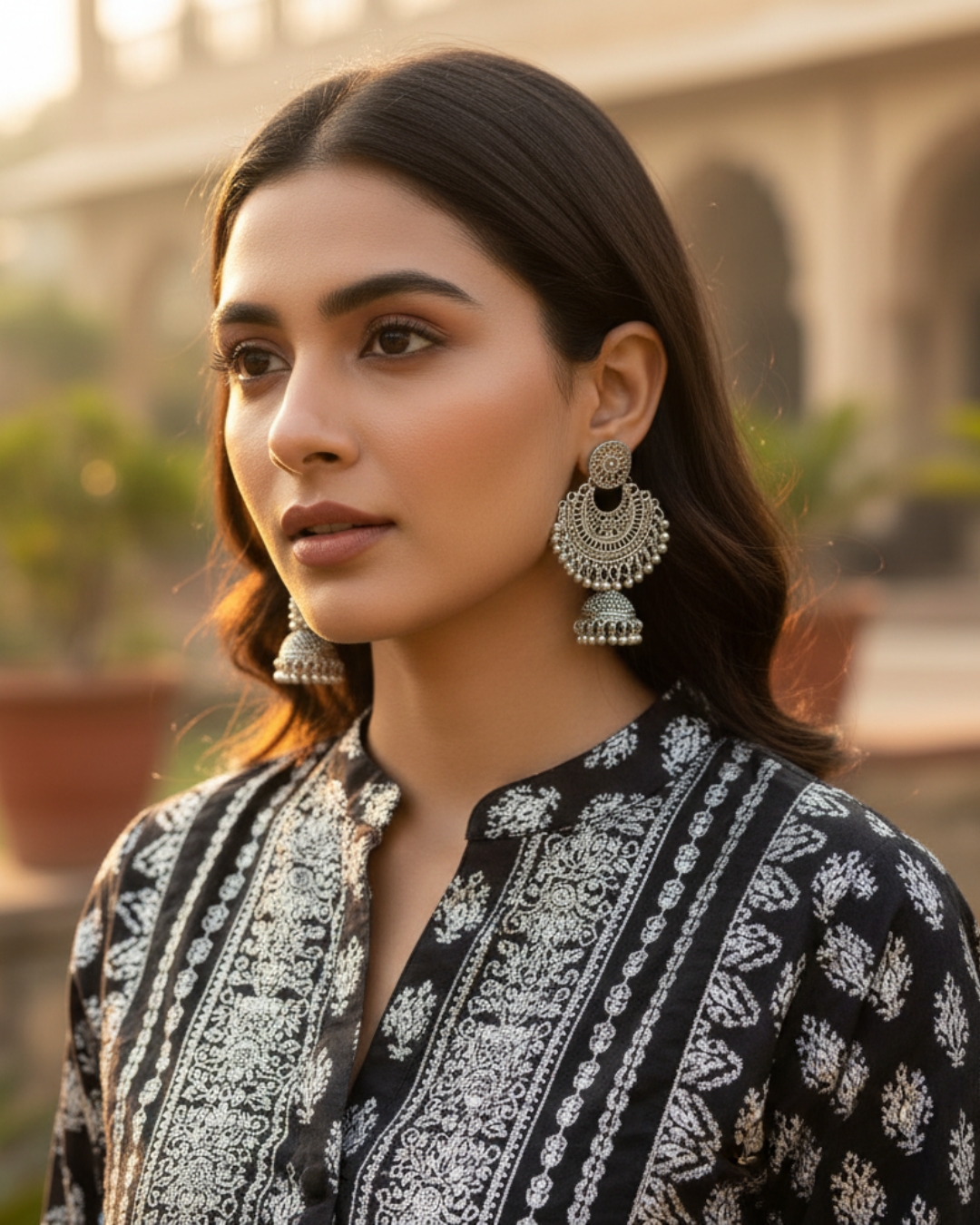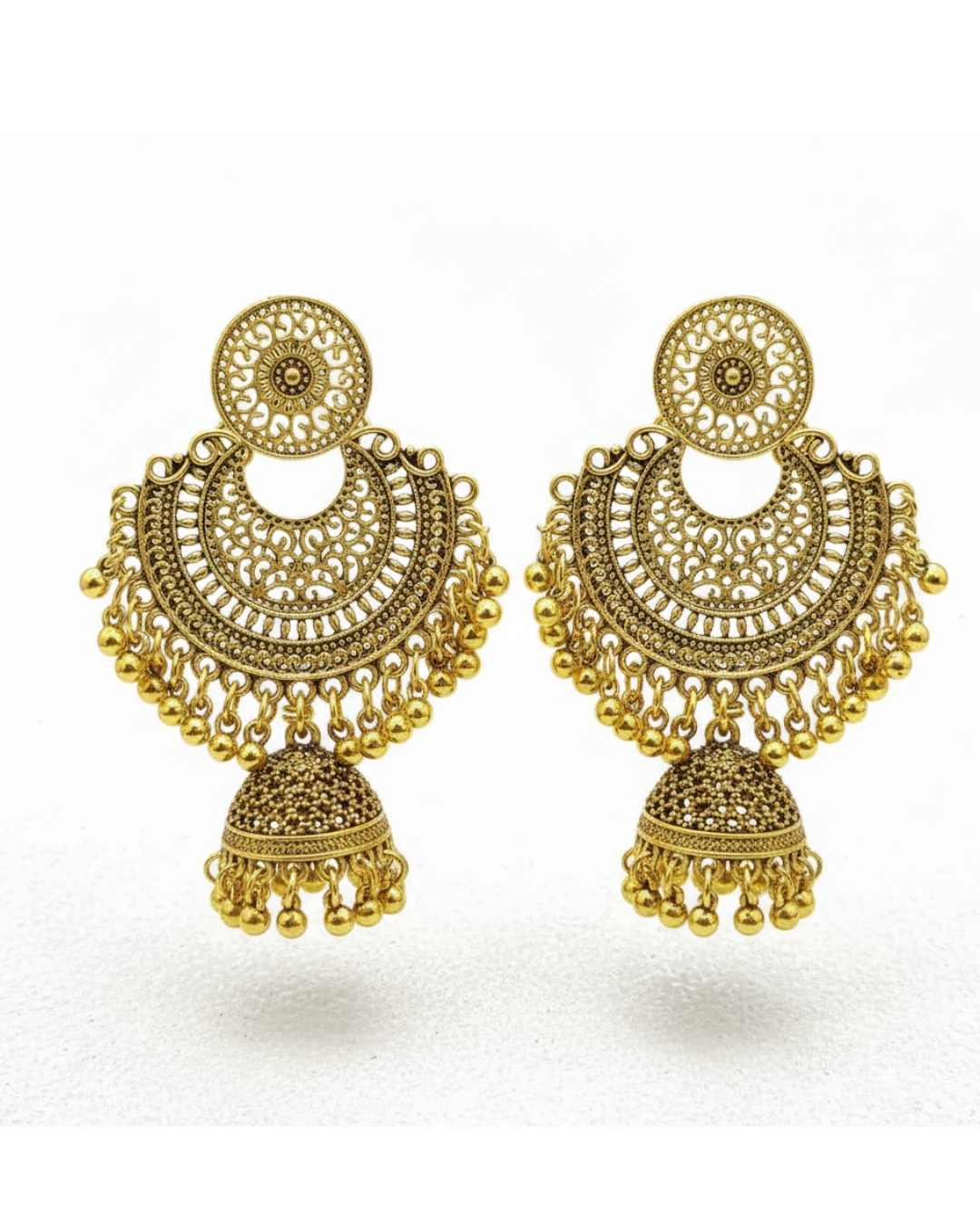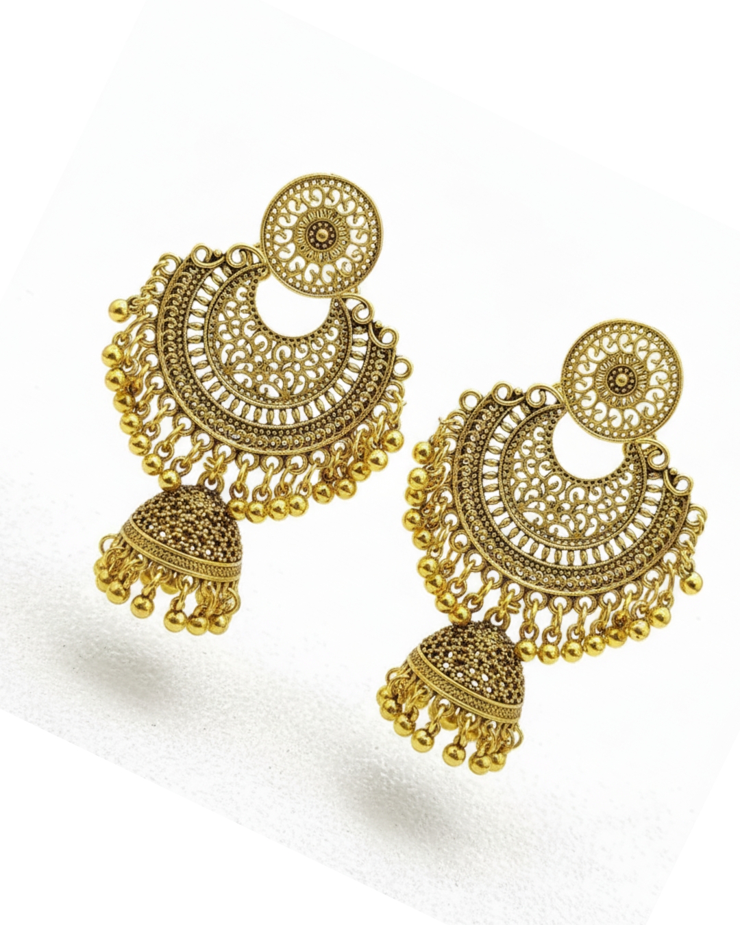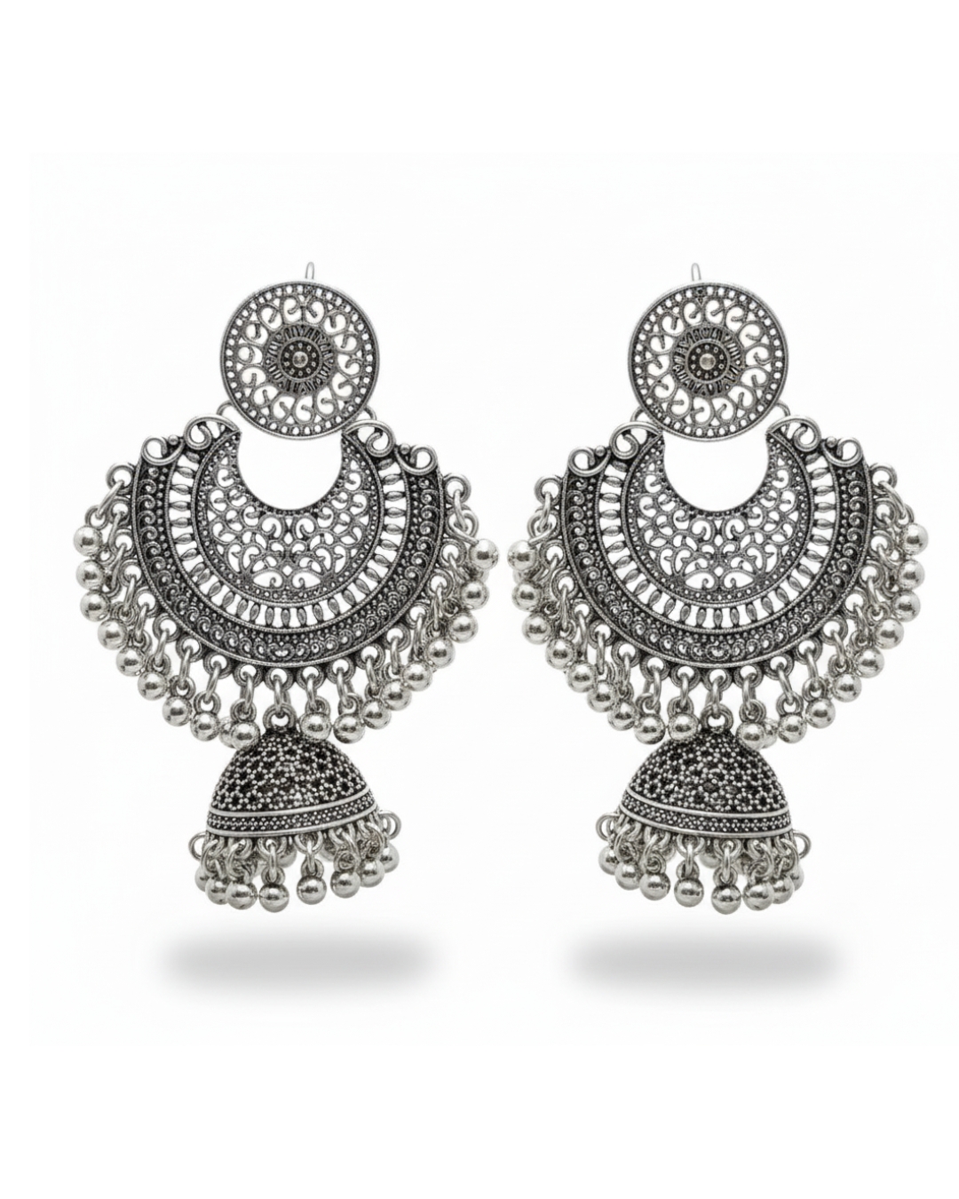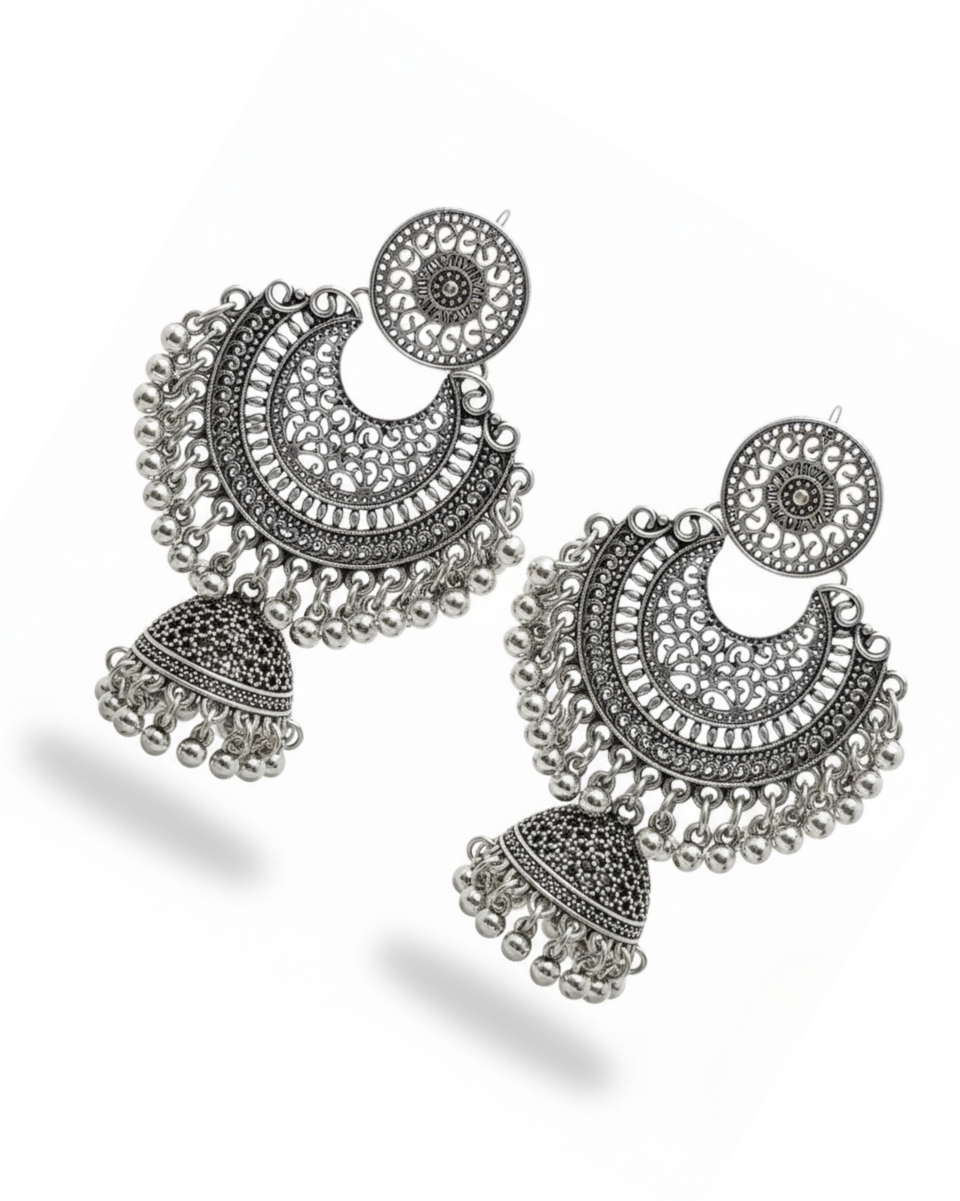 Gul-o-Gulzar Oxidized Silver/Golden Jhumka is designed with timeless elegance, combining floral artistry with a traditional touch. Ideal for weddings, festive events, and casual wear, this piece enhances your look with classic charm and versatility.
